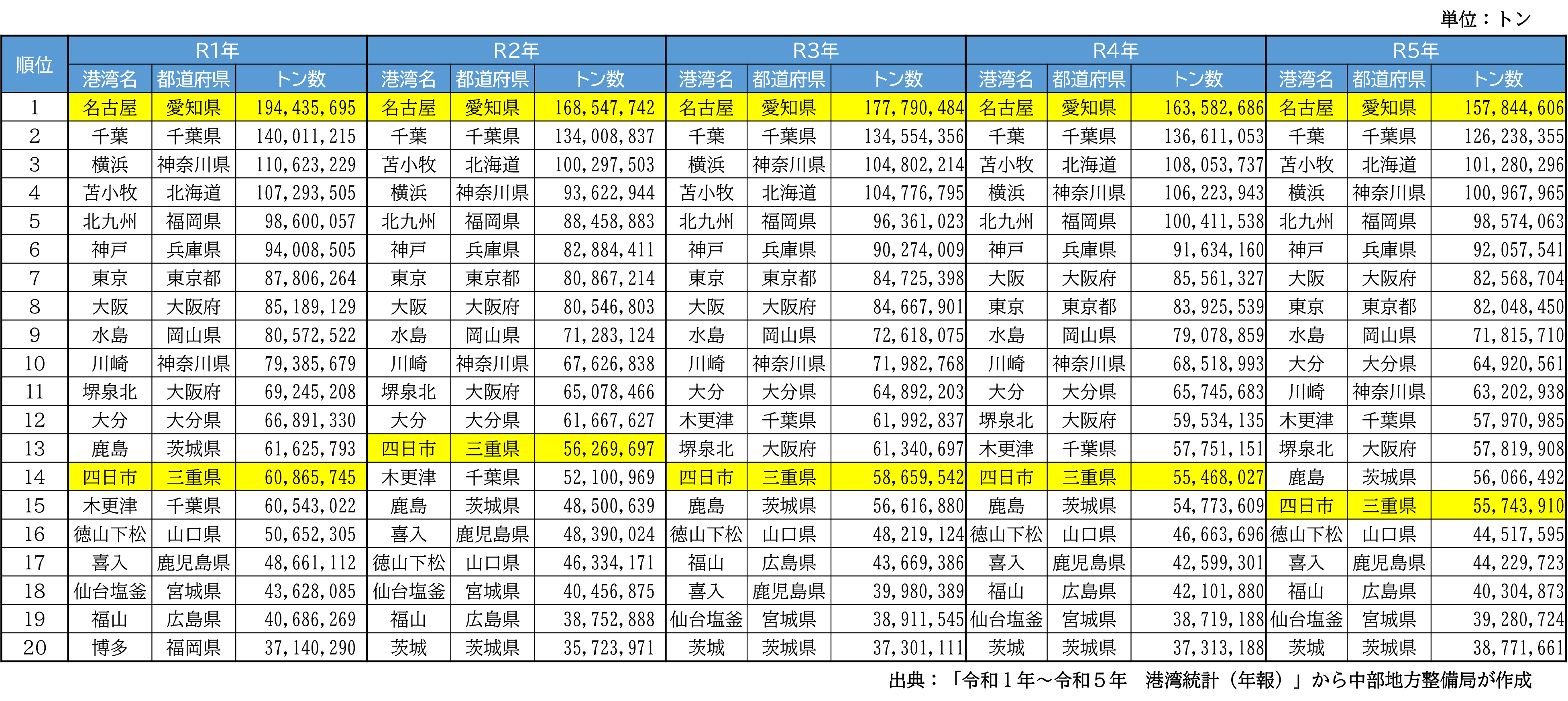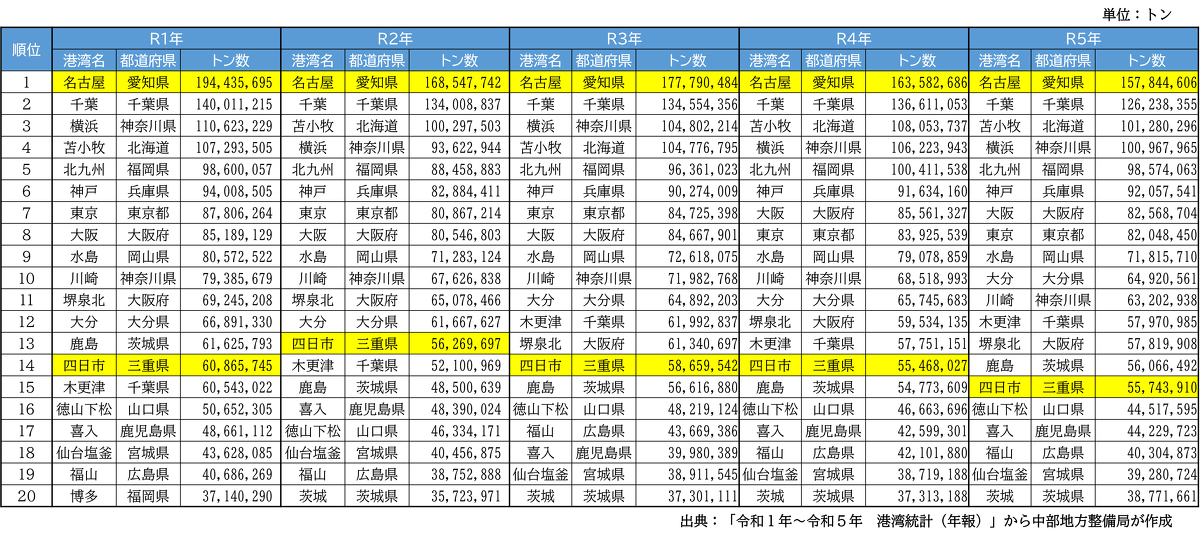 ・四日市港も上位20位に連続でランクインしている。
