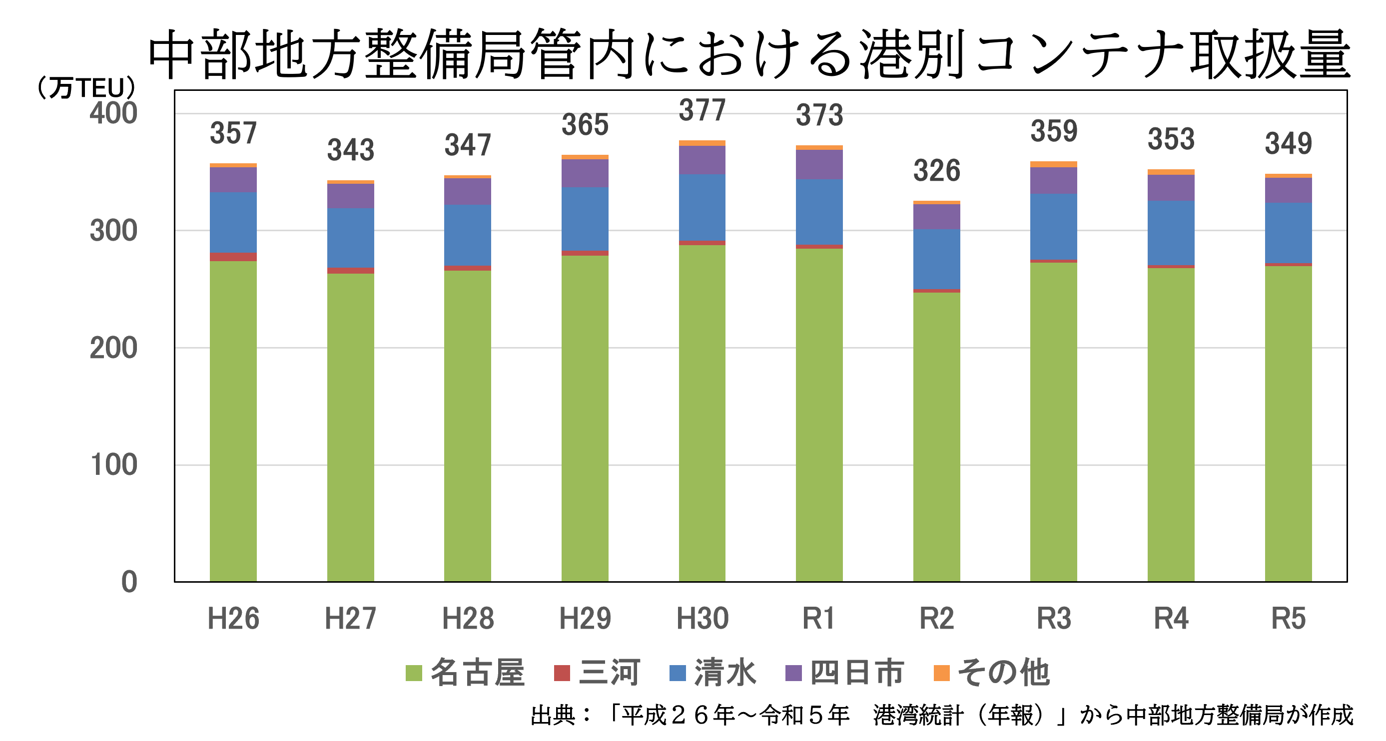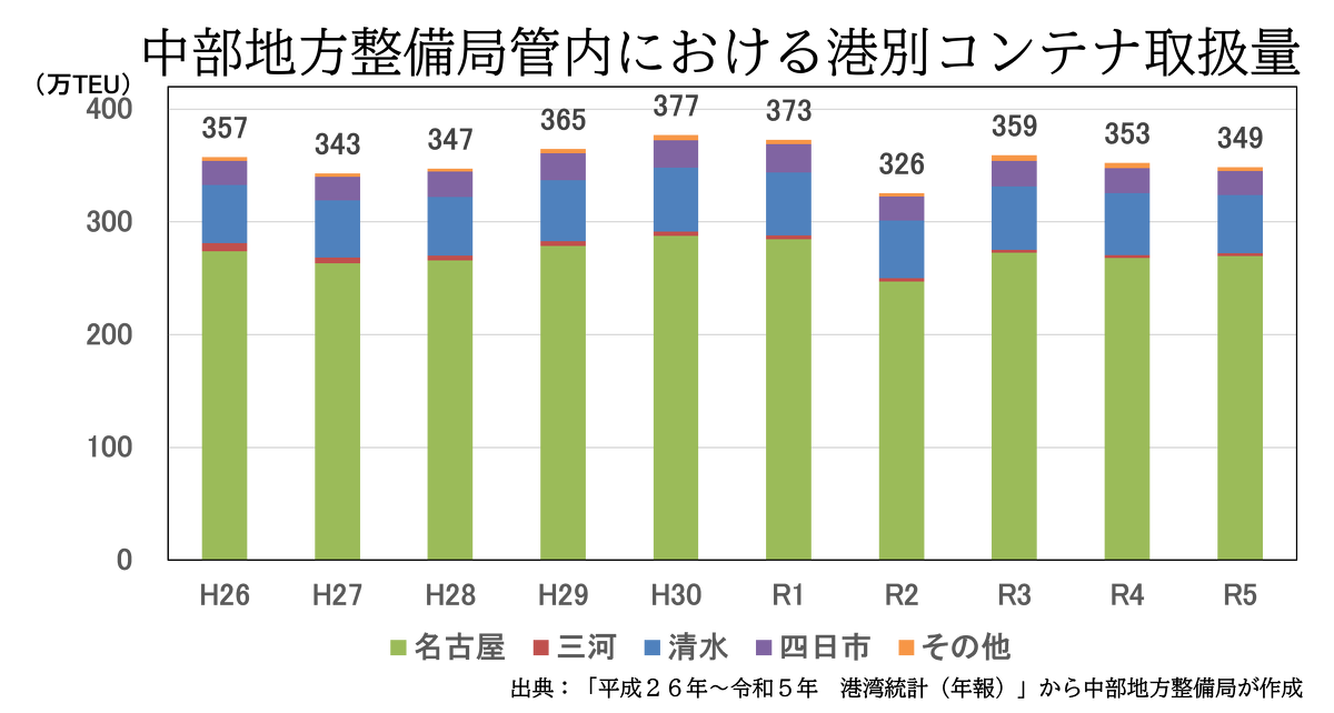 ・中部管内のコンテナ取扱量は、350万TEU前後で推移している。